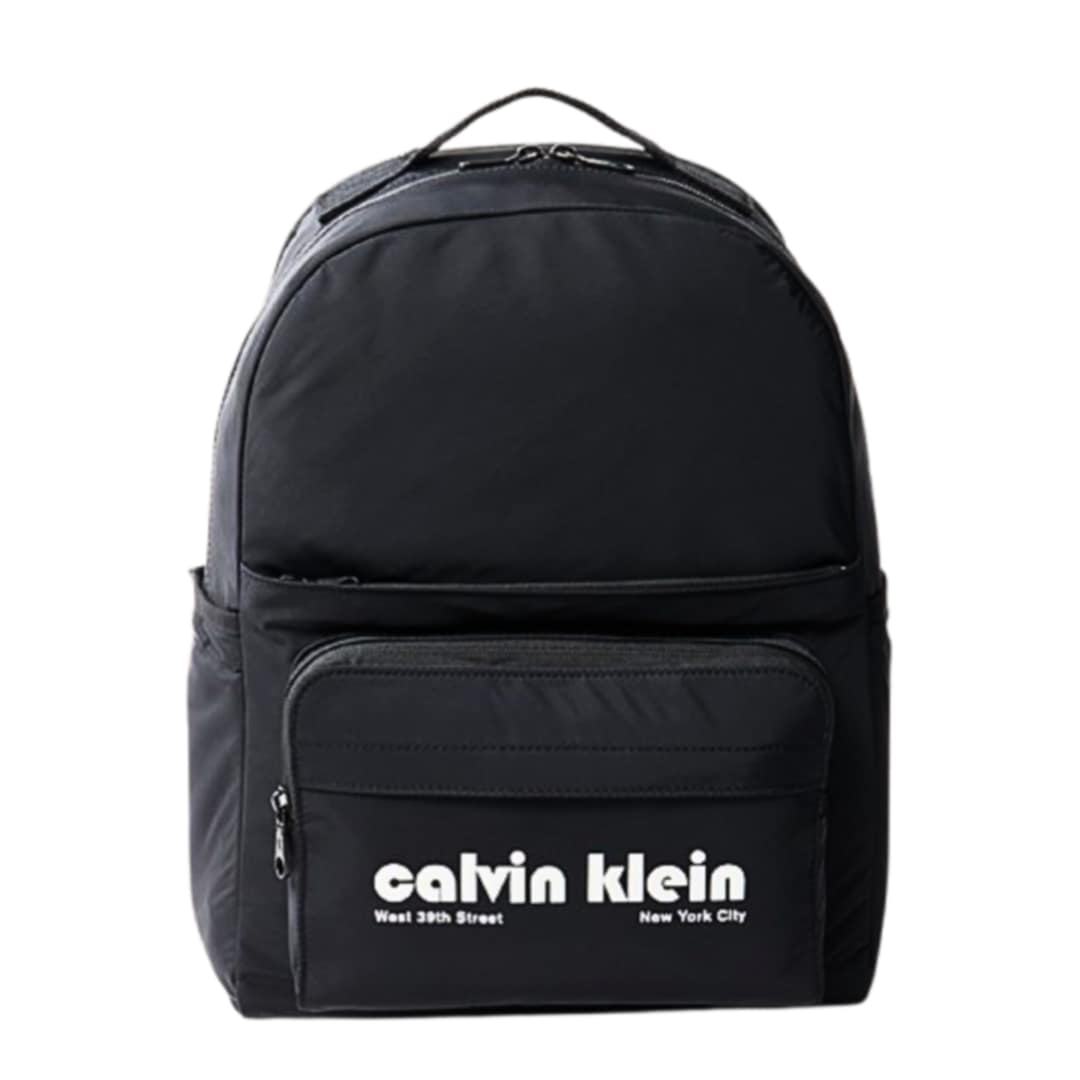 Sac à dos Calvin Klein noir avec logo imprimé, poche extérieure zippée et rangements intérieurs.