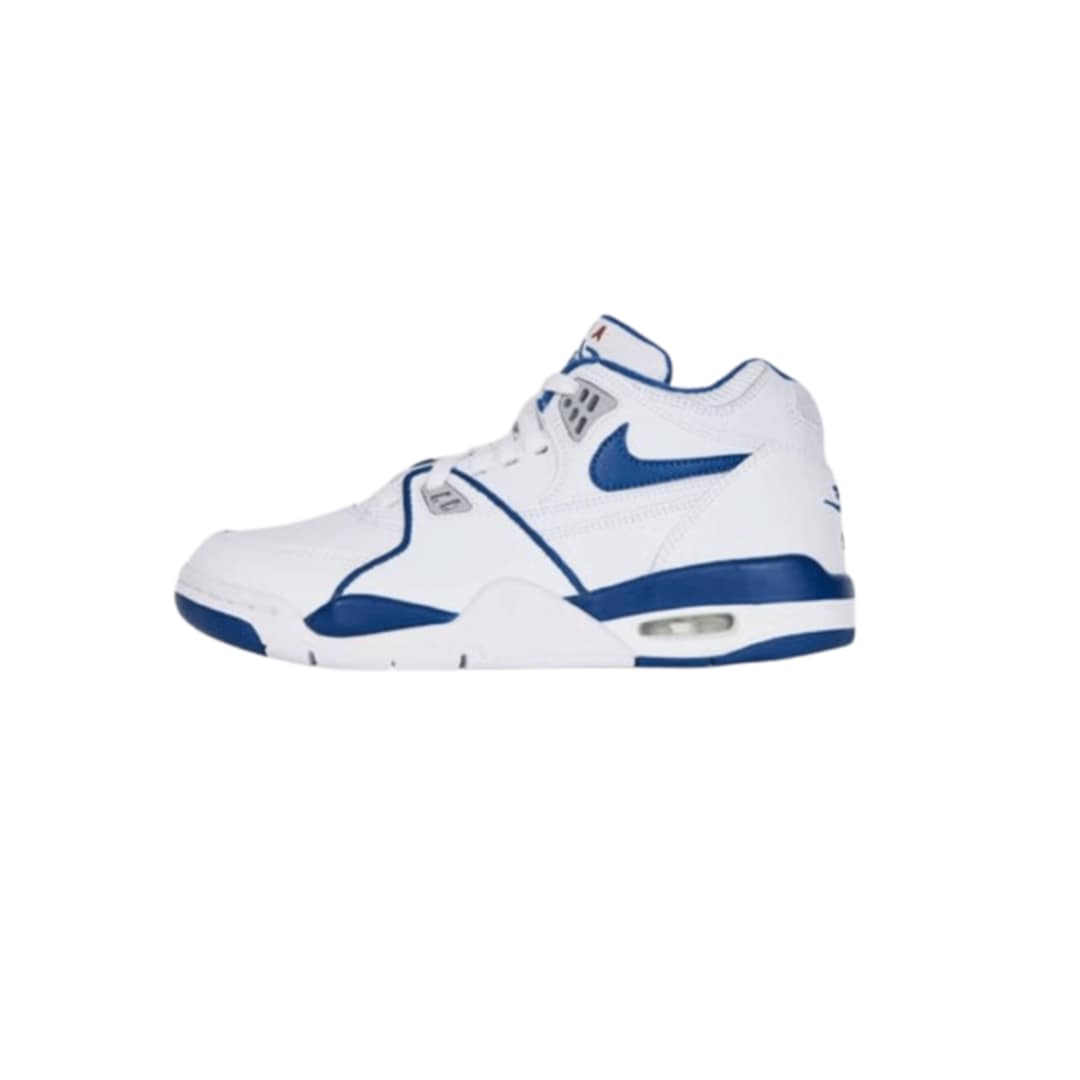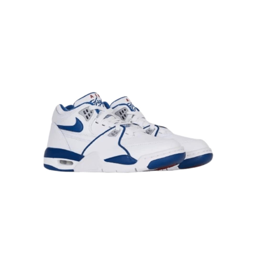 Photocatalogue (description de référence visuelle) – Modèle : Nike Air Flight ’89 True Blue (2020) – Couleurs : Blanc / Bleu royal / Rouge